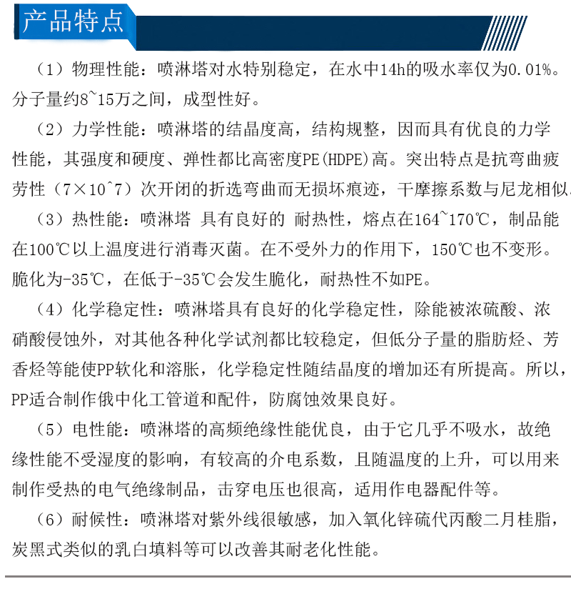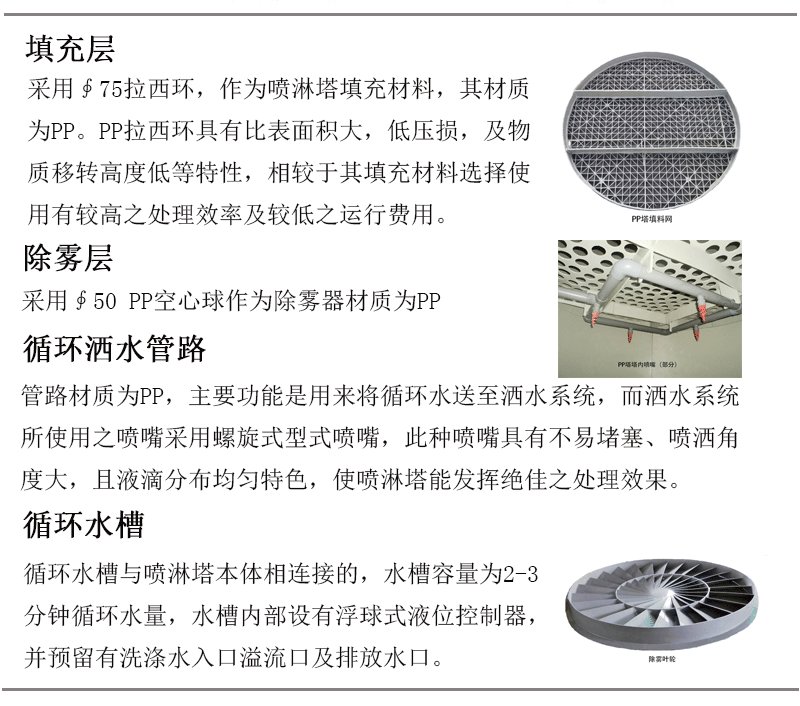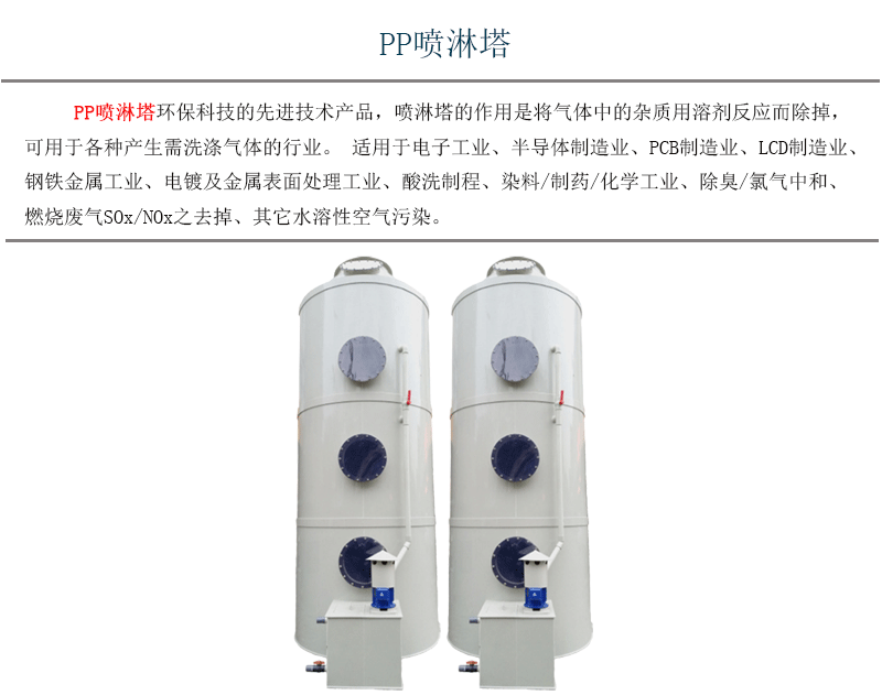 PP喷淋塔环保科技的先进技术产品,喷淋塔的作用是将气体中的杂质用溶剂反应而除掉,可用于各种产生需洗涤气体的行业。适用于电子工业、半导体制造业、PCB制造业、LCD制造业、钢铁金属工业、电镀及金属表面处理工业、酸洗制程、染料/制药/化学工业、除臭/氯气中和、燃烧废气SOx/NOx之去掉、其它水溶性空气污染。