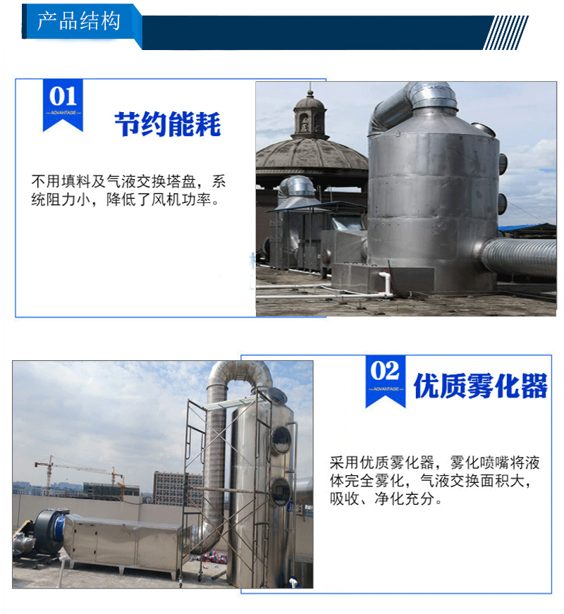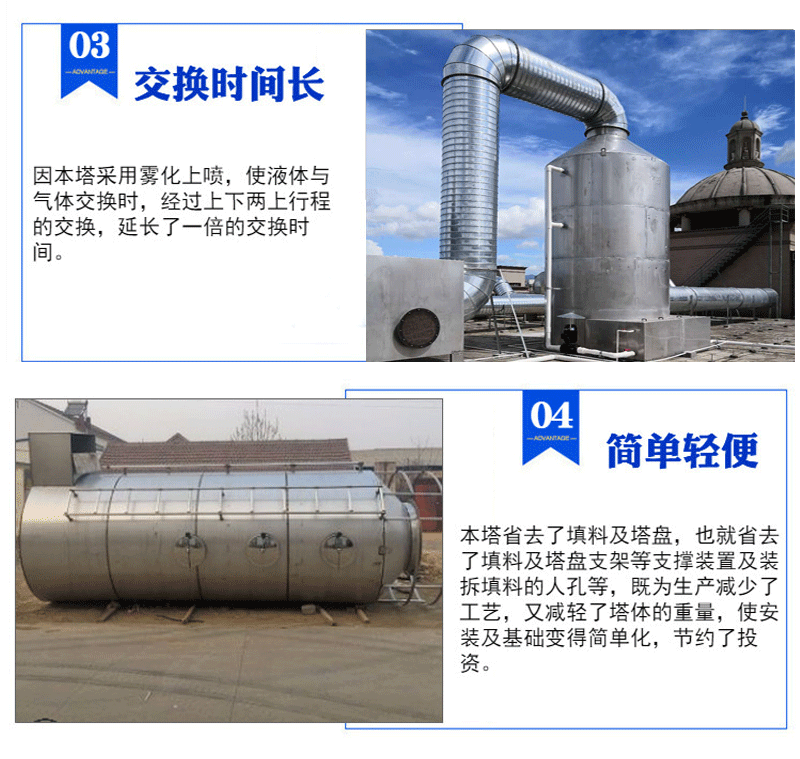 不锈钢喷淋塔环保科技的先进技术产品,喷淋塔的作用是将气体中的杂质用溶剂反应而除掉,可用于各种产生需洗涤气体的行业。适用于电子工业、半导体制造业、PCB制造业、LCD制造业、钢铁金属工业、电镀及金属表面处理工业、酸洗制程、染料/制药/化学工业、除臭/氯气中和、燃烧废气SOx/NOx之去掉、其它水溶性空气污染。