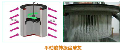 旋转振尘清灰采用手动振尘模式,只需要将旋转手柄顺/逆时针旋转1分钟左右,即可将粘附在滤筒表面的大颗粒粉尘清理干净。