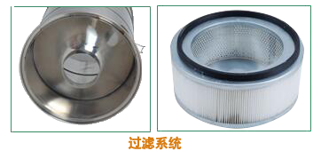 过滤系统方面采用内置旋风分离器+滤筒式过滤器,旋风分离器将大颗粒粉尘或水滴直接沉降在下收集桶,