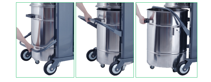 上下桶分离结构是本机标准配置,给使用者带来最大的便利就是清灰方便,当需要清理灰尘时,只需要将压杆上提,集尘桶自然下落至地面,拖动自带脚轮集尘桶倾倒灰尘,完成后压下压杆即可。