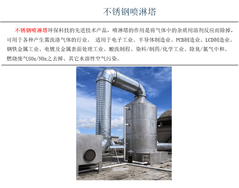 不锈钢喷淋塔环保科技的先进技术产品,喷淋塔的作用是将气体中的杂质用溶剂反应而除掉,可用于各种产生需洗涤气体的行业。适用于电子工业、半导体制造业、PCB制造业、LCD制造业、钢铁金属工业、电镀及金属表面处理工业、酸洗制程、染料/制药/化学工业、除臭/氯气中和、燃烧废气SOx/NOx之去掉、其它水溶性空气污染。